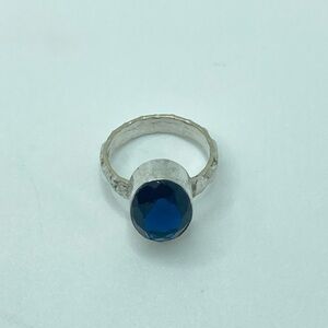 Vintage sterling silver ring with large oval shaped facet cut dark blue stone. Band has Diamond shapes and raised dots.