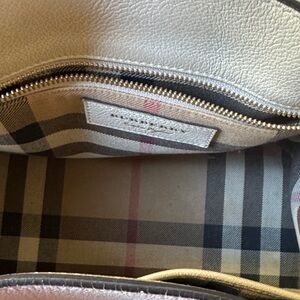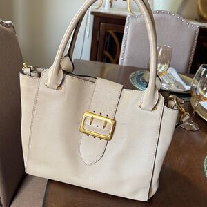 Chic Burberry tote in cream leather. Features a striking gold buckle. Perfect for elevating any outfit.