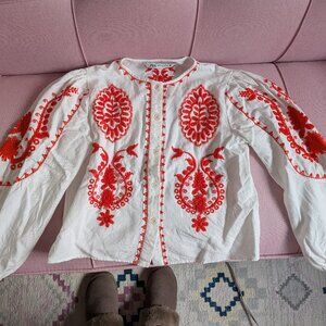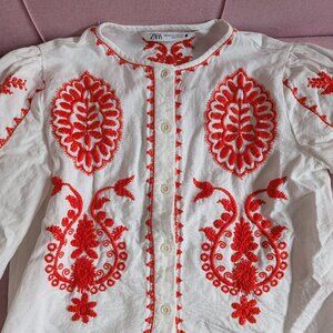Beautiful embroidered sturdy Zara top in excellent used condition size XS. White Bohemian style with red contrasting embroidery. Measurements: bust, 36 inches, length 20 inches. It's a cotton and linen mix. I also have a blue one available. Check out the listing in my closet. Thanks for stopping by😊