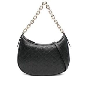 An elegantly crafted shoulder bag from Gucci, featuring luxurious black embossed calfskin leather showcasing the iconic GG emblem. The fluid design is accented by light gold-toned hardware and a chic chain and leather shoulder strap, providing a sophisticated touch. The interior is lined with soft black cotton linen and includes a zip pocket for secure storage, making it as functional as it is stylish.