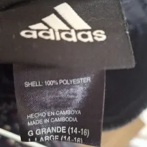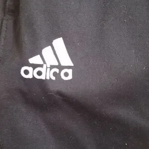 Sleek black pants with iconic Adidas logo. Ideal for sports or leisure. Rise 11", Inseam 29", waist 30". Drawstring, two side pockets. See pictures for imperfection.