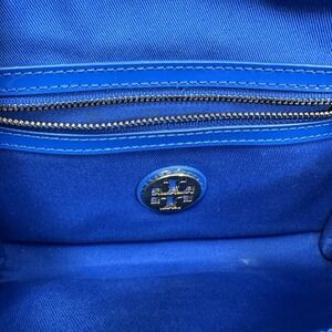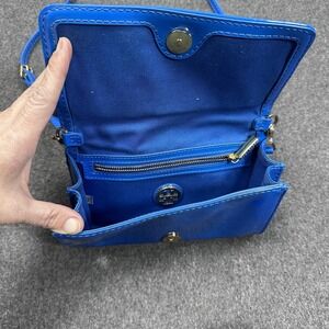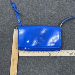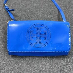 Pre-owned Tory Burch blue patent leather crossbody wallet wristlet with perforated logo detail. Includes adjustable detachable crossbody strap and wristlet strap. There are surface scratches and minor scuff marks on the patent leather as shown in photos, along with light hardware wear. All closures and straps are functional. See photos carefully for exact condition.