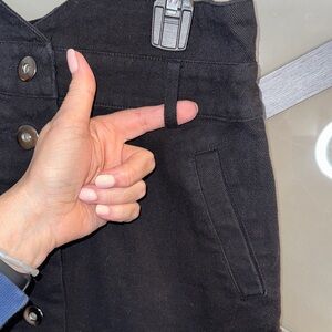 Chic black mini skirt with button-up front. Features side pockets. Ideal for versatile styling.