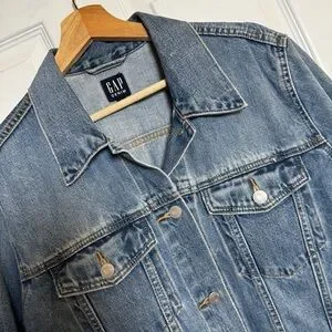 Classic GAP Denim trucker jacket in a timeless medium wash. Made from 100% cotton with that structured, authentic denim feel. Features traditional trucker styling including: