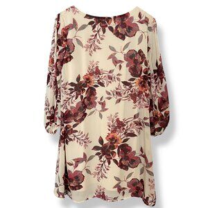 Lulus "Shifting Dears" beige chiffon floral mini shift dress with rust red, orange, and sage green. V-neck front, 3/4 length sleeves with open cut-out down to the cuffs. Pullover style.