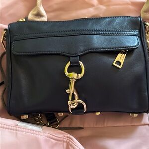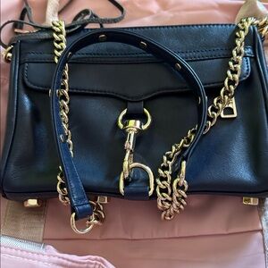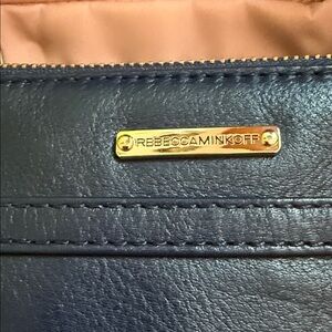 Stylish navy leather bag by Rebecca Minkoff. Features a gold chain strap. Perfect for versatile wear.