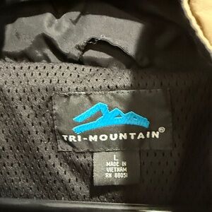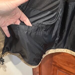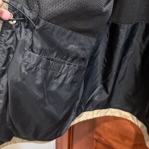 Stay stylish and comfortable with this versatile men's jacket. Featuring a sleek black and tan rain jacket design. It has both a zipper front closure and snaps, cord to cinch the waist in for a different fit. Long sleeves and lots of pockets. Features a hood that can also be rolled and stored in the collar of the jacket. Size L and in excellent condition. Worn very little.