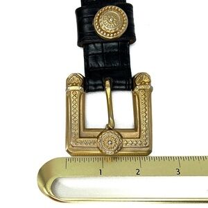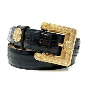 Description: Vintage 1993 women’s belt with croc embossed black leather strap and chunky, ornate metal buckle | 1.25” wide strap | Made in America