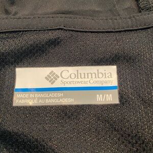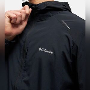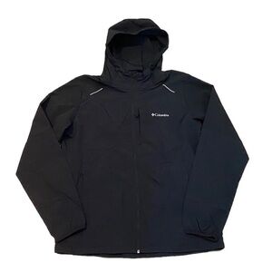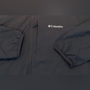Lightweight black windbreaker. Features hood and zip closure. Columbia logo on chest.