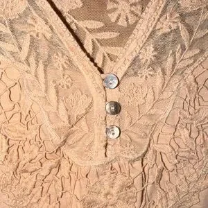 Chic top with delicate lace accents front and back. Soft fabric and button details and gathered wrist. Ideal for casual or dressy looks.