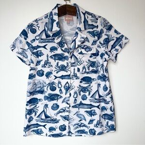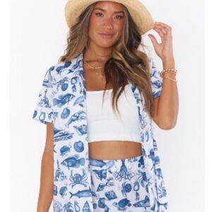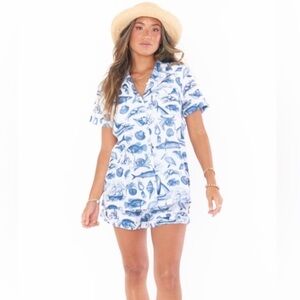 Kick off beach season looking super cute in our Home And Away. This is created from a lightweight poplin, perfect for all those summer adventures. Fabric decorated with a nautical print shapes an oversized collared top with a button front and chest pocket.
