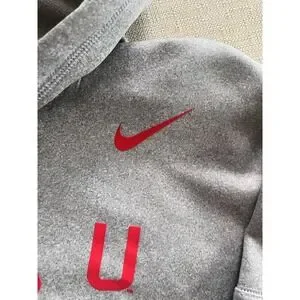The NIKE Dri-Fit BSU Bears Hoodie in size S is a stylish and functional piece of athletic attire. Made with fleece fabric in a gray color with red accents, this hoodie features long sleeves, a full zip closure, and a hood for added warmth and comfort. Perfect for sports enthusiasts and those looking to stay active during all seasons, this Nike hoodie combines quality, style, and performance in one versatile garment.
