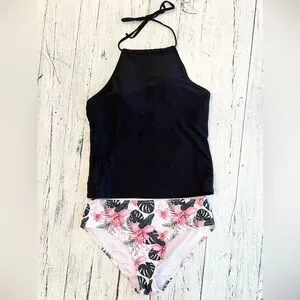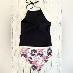 Beachsissi Black Halter Tankini with Floral Bikini Bottom Sz Large