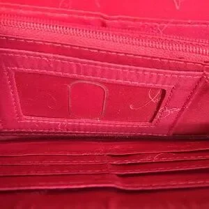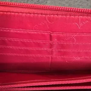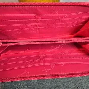 Bright floral wallet with pink and yellow designs. Stylish and eye-catching accessory.