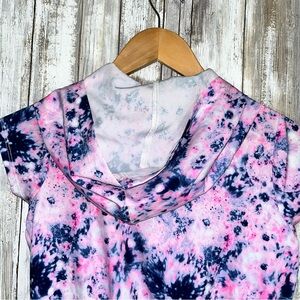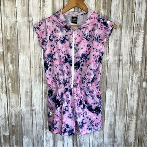 Stylish pink and black tie-dye romper with a front zipper. Perfect for casual outings.
