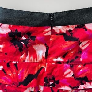 Larry Levine above knee mini skirt, Hawaiian red/white/black floral design. Brilliant color, layered ruffle style as shown, great quality. Excellent preowned condition. See details and measurement in photos!