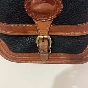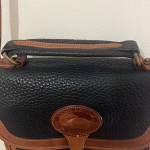 Dooney & Bourke Smaller Size Surrey Vintage Beautiful Black Tan All Wether Leather crossbody shoulder purse in good used condition.