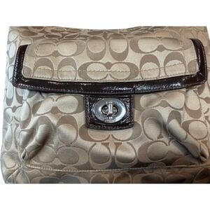 Coach Penelope Signature Sateen Convertible Hobo Bag F19282 in a sophisticated khaki and brown colorway. This classic silhouette features the iconic C logo pattern throughout the jacquard fabric, complemented by dark brown patent leather trim. The front is detailed with a functional turnlock pocket for easy access to essentials, while the main compartment secures with a smooth top zipper. Inside, you'll find a tonal sateen lining with a zippered security pocket and the authentic leather Coach creed. The adjustable leather shoulder strap provides a comfortable carry for daily use. There are a few pen marks on the interior of the bag, outside of the bag is in excellent condition with no visible flaws. This is a beautiful bag.