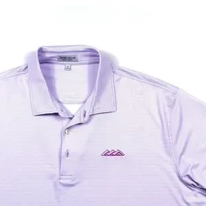 Peter Millar Summer Comfort polo shirt in a light purple and white geometric micro-print. This performance top features a moisture-wicking stretch fabric blend, a classic three-button placket, and a spread collar. A stylized pink mountain logo is embroidered on the left chest, and the hem includes side vents for a comfortable, mobile fit.
