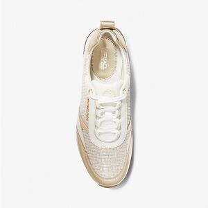 Elegant sneakers with gold accents and white mesh. Perfect for casual wear.