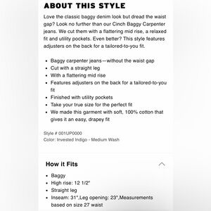 Love the classic baggy denim look but dread the waist gap? Look no further than our Cinch Baggy Carpenter jeans. We cut them with a flattering mid rise, a relaxed fit and utility pockets. Even better? This style features adjusters on the back for a tailored-to-you fit.
