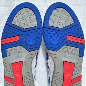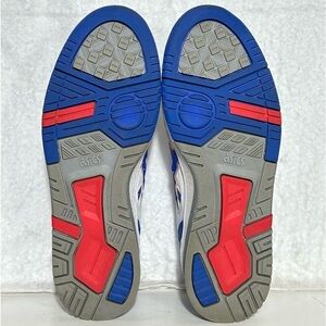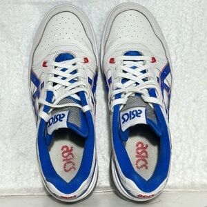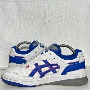 ASICS Mens EX-89 White/Blue Leather Athletic Basketball/Training Sneakers Shoes. Color: White/Blue/Red. Pre-owned Condition - refer to pictures for description of shoes. No rips or tears. Smoke free.