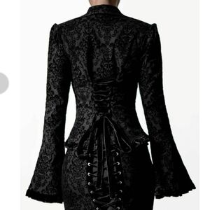 Chic black blazer with brocade velvet pattern. Features flared sleeves and black velvet ruffle details. lacings in the back and the fabric has lots of stretch. Ideal for a night out.
