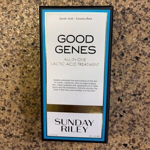 Enhance your skincare with Sunday Riley's Good Genes. Exfoliates and brightens for radiant skin. Elegant packaging in white, black, and gold.