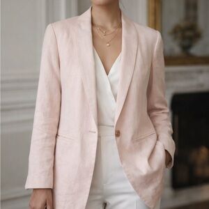 Chic light pink blazer with a single button closure. Perfect for a polished look.
