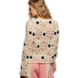 Designed in round neck long sleeve relaxed fit top in crochet with floral weave, scalloped edge.