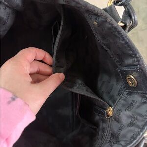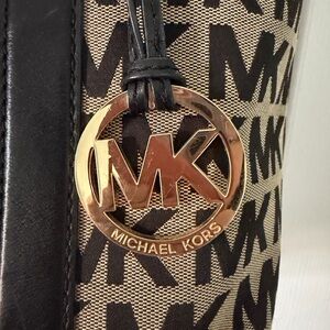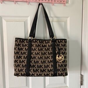 Elegant tote with iconic MK pattern. Features sturdy black handles. Ideal for daily essentials. Has minor makeup stains in interior, otherwise in perfect condition.