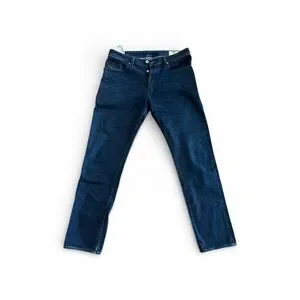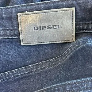 Diesel Booster jeans for men in excellent pre-owned condition. Classic dark wash blue denim with signature Diesel leather patch on the back and button fly closure. Comfortable stretch cotton blend fabric, clean and well maintained with no stains, holes, or excessive wear noted. Size tag 33. Fabric content: 83% cotton, 15% polyester, 2% elastane. Made in Colombia. Please review all measurements carefully for proper fit.