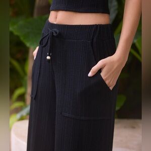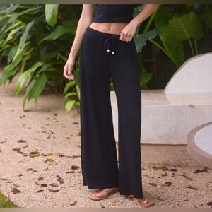 Ribbed wrap top and matching rib wide leg pants.