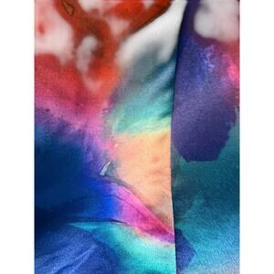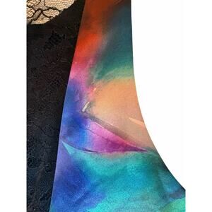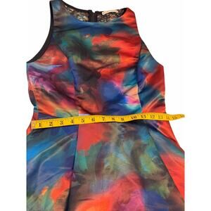 Stunning Alice + Olivia multicolored satin cocktail dress in a flattering fit and flare silhouette, size 6. This vibrant designer dress features a structured sleeveless bodice with a modern high neckline, luxe satin fabric in a bold watercolor-inspired print, and a beautifully detailed black lace back panel for added elegance and contrast. The skirt flares softly from the waist for a feminine, party-ready shape. Hidden back zip closure for a sleek fit. Perfect for cocktail parties, wedding guests, holiday events, date nights, or special occasions. There are a couple areas that may appear to have faint marks, though they may be part of the fabric pattern—please review photos carefully. Colors and details may vary slightly due to lighting and display settings.