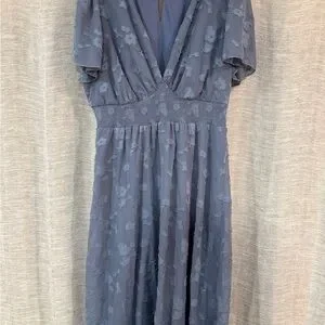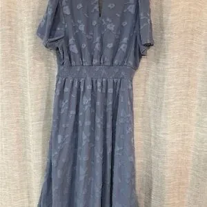 Chic midi dress with floral texture. Features a flattering V-neck and short sleeves. Ideal for versatile styling.