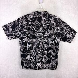 VTG OP Ocean Pacific Hawaiian Camp Shirt Mens L Black White Floral Aloha Rayon