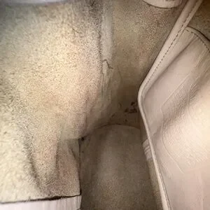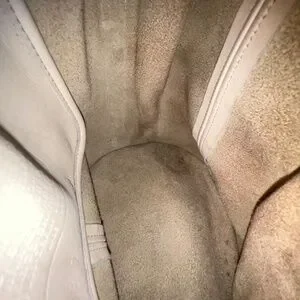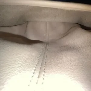Drawstring needs reinforcement at point pictured. Not visible from outside of bag. Interior has pen marks throughout but none have bled through to outside yet. Would caution during any conditioning.