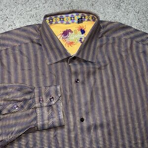 Robert Graham Men's 2XLB Brown Pattern Flip Cuff Long Sleeve Button-Up shirt is a stylish and versatile addition to any man's wardrobe. Made from a blend of silk and cotton, this woven shirt features a classic collared neckline, button closure, and striped pattern. The big and tall fit is designed for comfort and a regular fit, making it suitable for all seasons