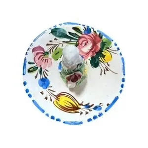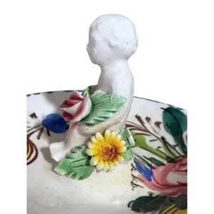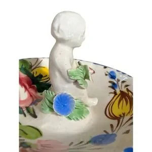 This item is a vintage Italian hand-painted ceramic ring dish, designed in the Capodimonte style. The dish features hand-painted floral motifs, often including roses and vibrant yellow and blue accents. The central figure is a cherub (also referred to as a putti in Italian art) clutching a large pink flower. Hand-painted with multicolored floral designs and a scalloped edge. Made in Italy.