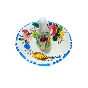It is made of ceramic pottery, specifically a type of Majolica (tin-glazed earthenware) known for its colorful, high-gloss finish. These are frequently described as being in the Capodimonte style, which is characterized by detailed porcelain or ceramic figures and floral decorations. Size is approximately 3 inches tall with a diameter of approximately 5 inches.