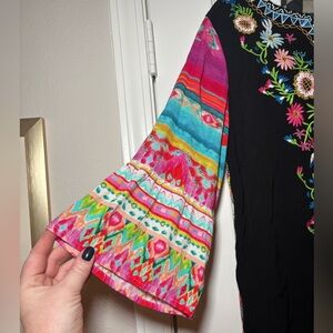 Stunning mixed-print design with vibrant embroidery on the front and hem, plus colorful boho sleeves. Lightweight and flowy—super flattering!