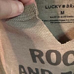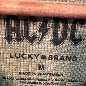 Rock on with this AC/DC khaki tee by Lucky Brand. Perfect for music lovers. Raglan with long sleeves. Intentionally distressed v-neck. Comfy and lightweight.