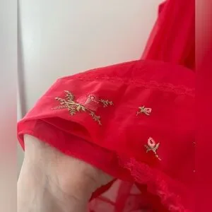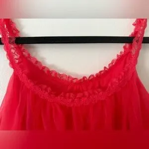 Keywords: 1960s vintage Vanity Fair nightgown, 60s red baby doll nightie, sheer nylon chiffon lingerie, embroidered rose nightgown, floral embroidery hem, lace trim nightie, vintage boudoir lingerie, romantic sleepwear, coquette aesthetic, cottagecore lingerie, feminine heirloom piece, retro lingerie 1960s, mod era sleepwear, bridal trousseau nightgown, honeymoon lingerie, pinup inspired lingerie, soft girl aesthetic, balletcore sleepwear, vintage red slip dress, sheer overlay nightgown, flowy babydoll silhouette, empire waist nightie, true vintage lingerie, collector, classic nylon nightgown, 60s romantic fashion, dreamy feminine loungewear, Y2K coquette vibes, girly vintage sleep dress, boudoir, rare vintage lingerie XS