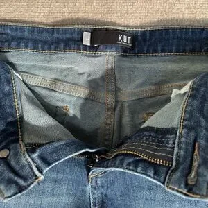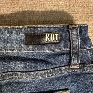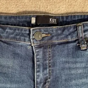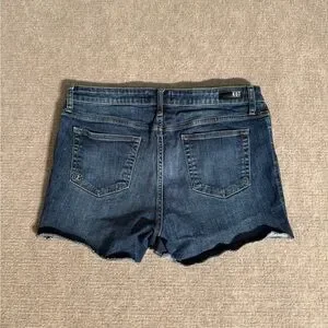 Keywords: Kut from the Kloth shorts, Gidget fray, medium wash denim, clean jean shorts, raw hem shorts, cotton denim, classic jean shorts, summer staple, casual chic, everyday denim, modest shorts, women’s size 12 denim, structured cotton shorts