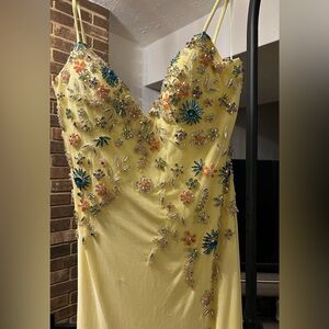 Stunning Mac Duggal formal gown in a beautiful buttercup yellow shade. Features delicate floral embellished beading across the bodice and along the hip for a romantic, eye-catching look. The V-neckline and spaghetti straps add elegance, while the high side slit gives it a modern, sleek touch.