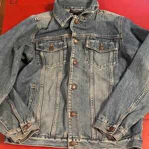 Stylish blue jean jacket. Features classic button-up design. Perfect for casual wear.