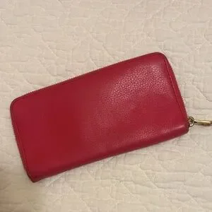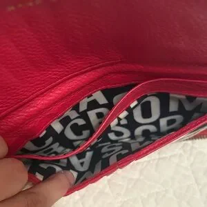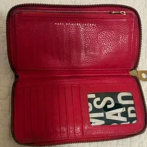 Elegant & Authentic Marc Jacobs wallet in vibrant red/pink leather! Monogram inside with multiple card slots, pockets and zipper pocket. Used, but still lots of life left.