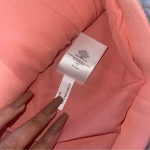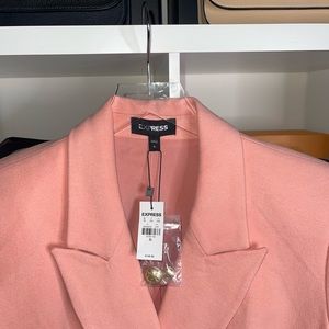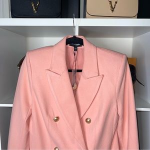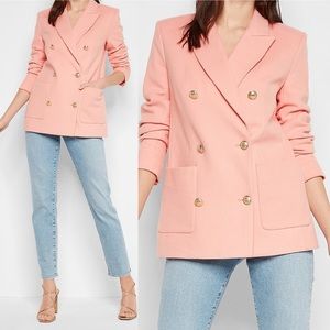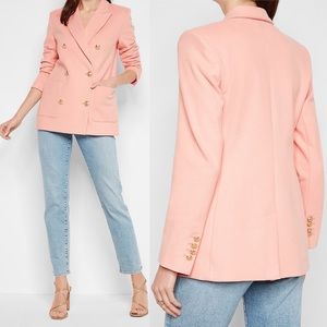 So cute! 🤍 Brand new with tags! Features a double-breasted button front in gold-tone novelty buttons, peak lapels, long sleeves with button cuffs, front hand pockets, flannel knit fabric, a vented back, a straight hemline and fully-lined. Color: Peachy Pink/Gold. Size XL.