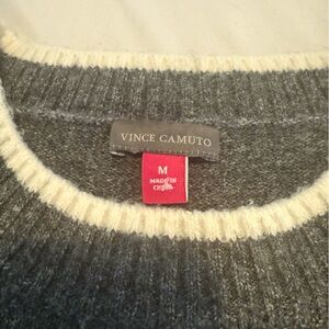 Chic and cozy Vince Camuto striped sweater featuring a classic round neckline and relaxed silhouette. The gray and white stripe pattern makes it easy to style with jeans, trousers, or leggings for an effortless everyday look.