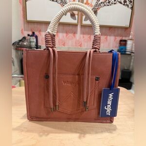 • This eye-catching western handbag features cow printed, a sturdy woven rope handle, and traditional whipstitch detailing with playful leather tassels.